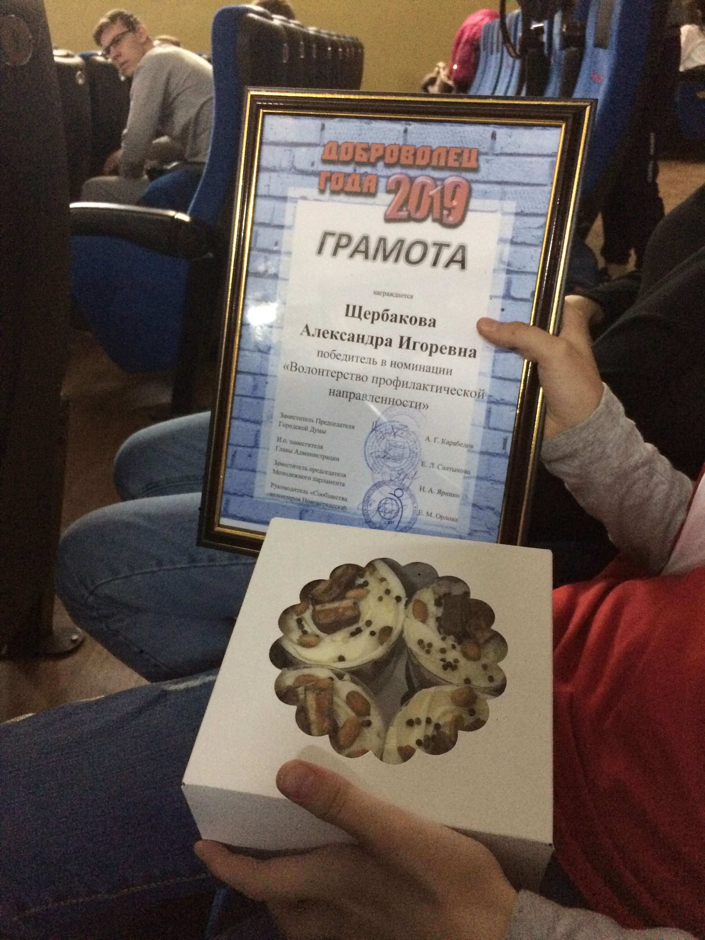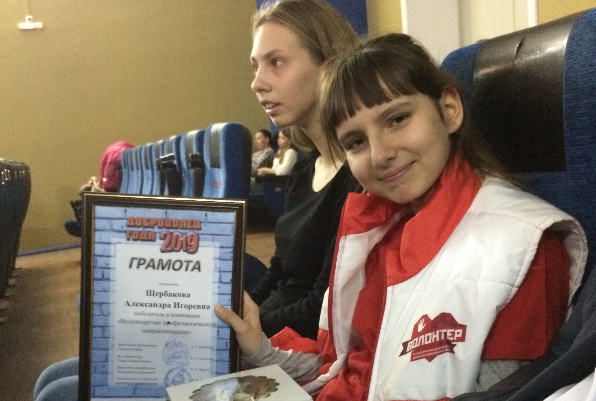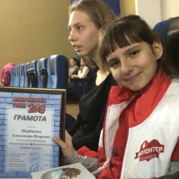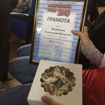 Итоги конкурса «Доброволец года 2019» были подведены в Новочеркасске 7 декабря 2019 г. в Центре воспитания и досуга детей «Эстетика». Участниками конкурса стали школьники, студенты колледжей и ВУЗов г. Новочеркасска. В номинации «Волонтерство профилактической направленности» стала двенадцатилетняя Александра Щербакова.